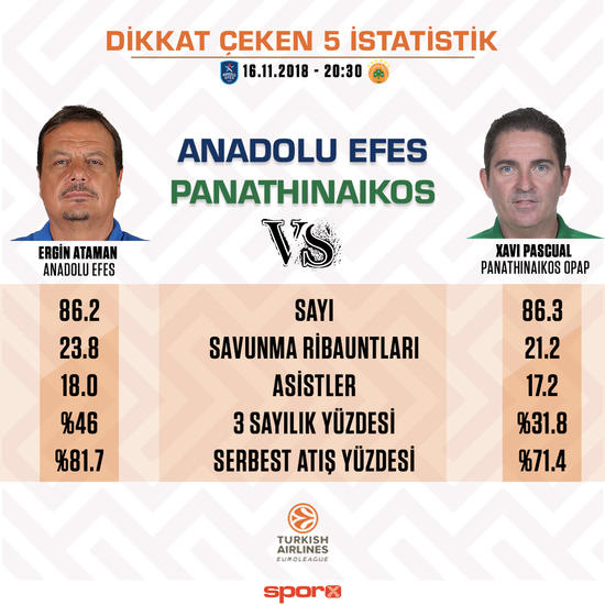 Anadolu Efes, bu sezon oldukça formda. EuroLeague'de oynadığı 6 maçın 4'ünü kazandı. Son olarak Gran Canaria'yı deplasmandaki mücadelede mağlup etmeyi başardı. Panathinaikos da İstanbul'a çok moralli geliyor. Atina'daki Yunan derbisinde Olympiakos'u mağlup ettiler.